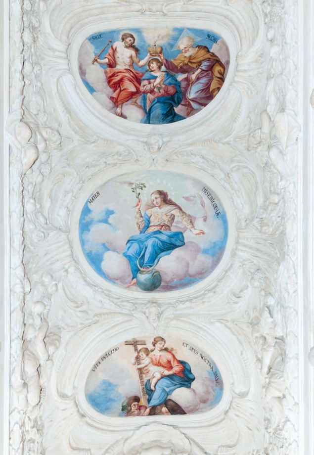 – Igen, Maria Immaculata, és a következő felirat kapcsolódik hozzá: „Mater misericordiae” („Irgalmasság Anyja”). Ebben a szakaszban a harmadik kép Mária megkoronázása. Krisztus és az Atyaisten koronát tart Mária feje fölött, a korona felett pedig a Szentlélek galambja lebeg, dicsfénytől övezve. A felirat: „Salve Regina” („Üdvözlégy, Királynő”). A következő három festmény az újabb lépcsőszakaszban látható. A lépcsőház felső lépcsősorának mennyezetén, az első képen az akkor ismert négy földrész hódol Mária előtt. Fent az égen középütt aranyló és sugárzó Mária-monogram. A földön a négy kontinens megszemélyesítői térdepelnek, Máriát dicsőítve. A figurák szájától egy-egy mondat indul a Mária-monogram felé: „O pia! – O clemens! – O dulcis! – Virgo!” („Ó, kegyes! Ó, irgalmas! Ó, édes! Szűz!”) A következő festmény egy „Kereskedők hajója”-ábrázolás. Hullámzó tengeren kétárbocos vitorlást láthatunk. Az elülső felépítményen lévő árbocon Mária-monogramos zászló, a vitorlán liliomágaktól körülvett rózsa; a tatárbocon IHS-monogramos zászló, a vitorlán monstrancia. Az ábrázolás forrása a Példabeszédek könyvéből „A derék asszony dicsérete”, amelyet Máriára vonatkoztattak. Balra és jobbra fent mondatszalag: „Et Iesum, benedictum / fructum ventris tui, – nobis post hoc / exsilium ostende” („És e számkivetés után mutasd meg nekünk Jézust, méhednek áldott gyümölcsét”). A harmadik mennyezetfestményen a Krisztusnál közbenjáró Szűzanyát láthatjuk: arany trónuson, arany baldachin alatt trónol Krisztus, előtte térdepel az alázatosan meghajló Mária. A felirat: „Eia, ergo, advocata nostra, illos tuos / misericordes oculos ad nos converte” („Fordítsd ránk tehát, szószólónk, irgalmas szemedet”).