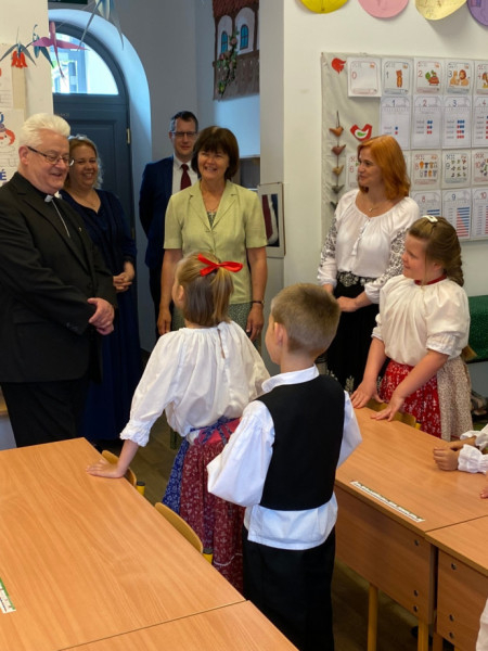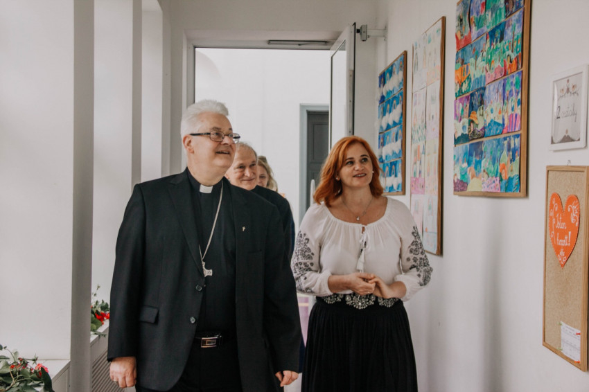 A főpásztor találkozott a pedagógusokkal, a diákokkal és a szülők képviselőivel. A ballagó diákok itt búcsúztak el iskolai közösségüktől, hálát adtak egymásért, tanáraikért, családjaikért és az elmúlt évekért. Spányi Antal püspök több osztályközösséggel is találkozott, köztük a legkisebbekkel, akik énekszóval köszöntötték névnapja alkalmából.