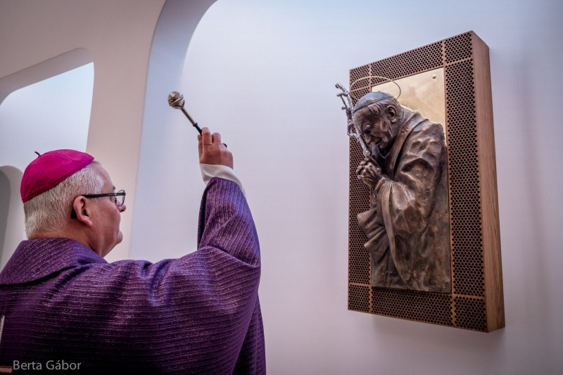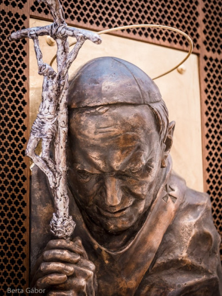 Szent II. János Pál pápa a templom védőszentje, jelmondatában is azt hirdette, egészen az Istené akar lenni. Ő maga nyilván egészen más utat járt be, mint a Szűzanya, de mindig azt kereste, mit tenne Jézus az ő helyében. Rábízta magát a Boldogságos Szűz Máriára, így járta végig azt az életutat, amelyre az egész világ tisztelettel tekint. Legyenek ők az itt élők, az itt imádkozók példaképei! Kísérjen mindannyiunkat a Boldogságos Szűz Mária oltalma és a szent pápa égi közbenjárása, hogy a mi életünk is egyre inkább odaadott és szent élet legyen, lsten jelenlétében – mondta a főpásztor.