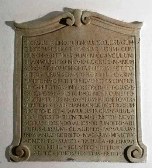Már a könyvtár 1774-es alapításakor elkészült az a márványtábla, amely latin nyelven tudatta az olvasókkal a helyes könyvtári magaviselet szabályait. Íme a táblán található szöveg, Fényes Miklós fordításában: