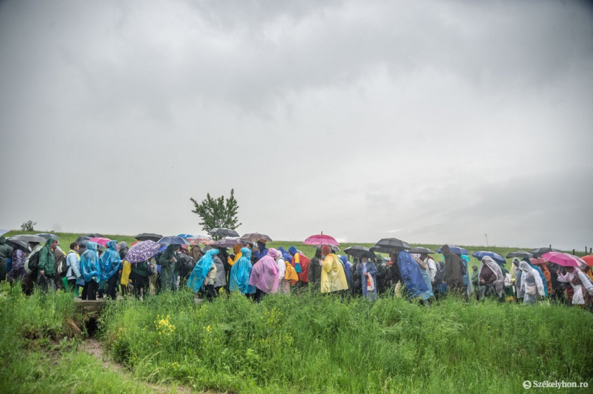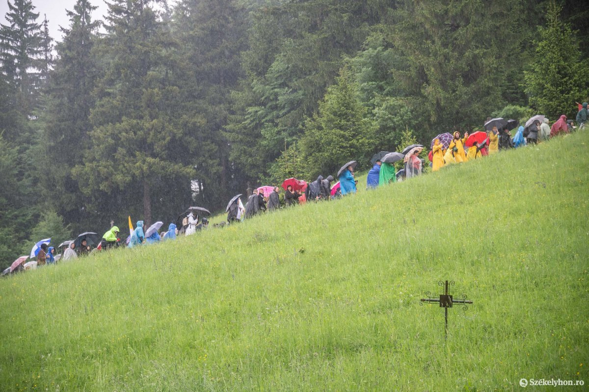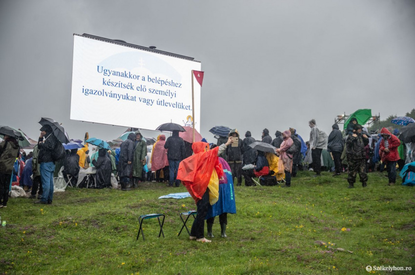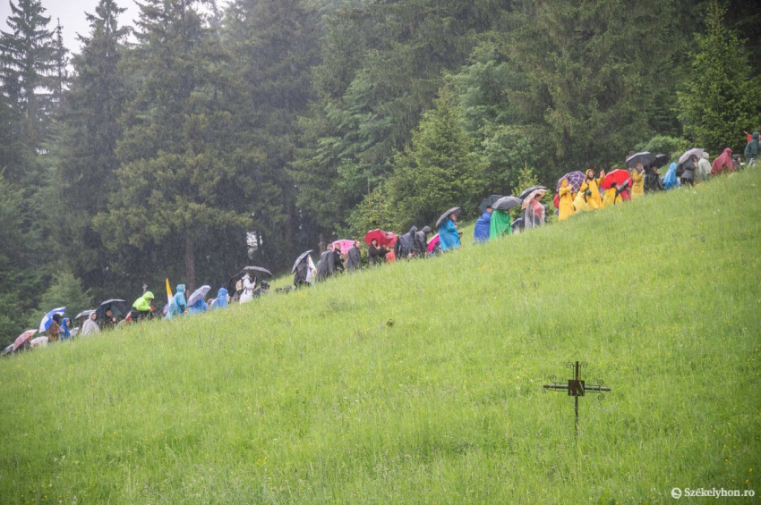 A zuhogó eső nem szegi kedvüket a zarándokoknak, akik vonatokkal, buszokkal vagy gyalog érkeznek Csíksomlyóra a pápai szentmisére, és foglalják el helyüket a Kis- és Nagysomlyó-hegy közötti nyeregben kialakított szektorokban. (A szentmise magyar idő szerint fél 11-kor kezdődik, a Duna TV élőben közvetíti.)
