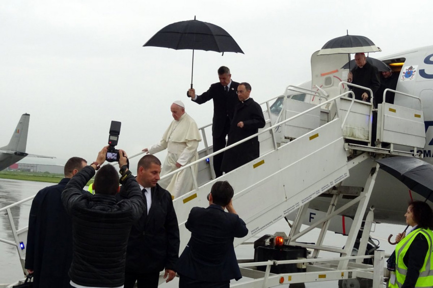 A marosvásárhelyi reptér igazgatója, Peti András tudatta, reggel 8 óra után 20 perccel landolt a Tarom légitársaság különjárata, a pápát pedig a repülőgép lépcsőjének aljában fogadták, amitől nem messze várta egy Volkswagen típusú fekete személygépkocsi, amely néhány percen belül elindult a Csíksomlyóra tartó helikopterhez.