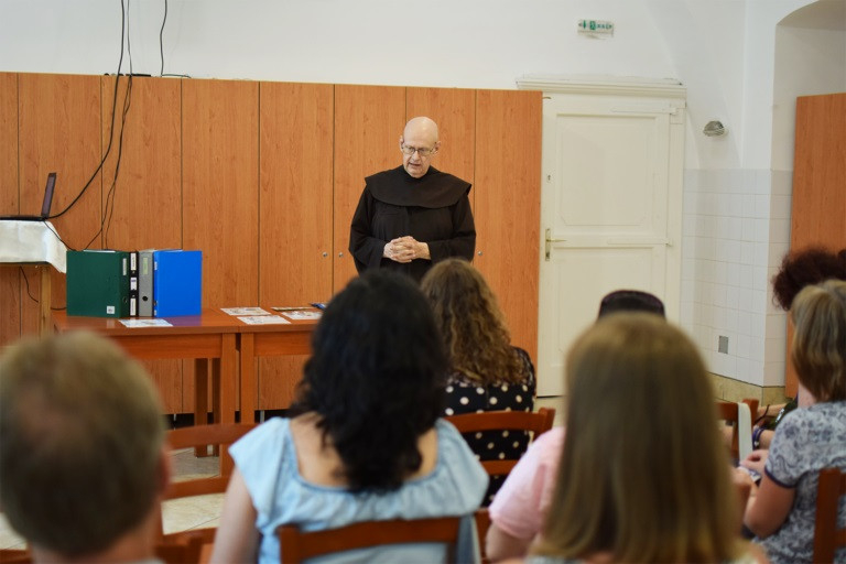 Az intézményt bemutatva Szabó József OFM lelki igazgató tartott beszámolót az ASK történetéről. „A ferencesek már az 1330-as évek közepén letelepedtek és kolostort alapítottak Gyöngyösön. Ez a rendház nagyon sokáig – a város helyzetéből adódóan is, mivel a hegy és az Alföld találkozási pontján áll – fontos szerepet töltött be: mondhatjuk, hogy egy időben ez volt a rend hazai központja. Egészen 1950-ig itt volt a szalvatoriánusok (az akkor Magyarországon működő ferences tartományok egyike) szemináriuma, itt tanult Paskai László bíboros is. Amit nem sikerült a törököknek, az sikerült Rákosinak: 1950-ben egy rendelettel elűzte innen a ferenceseket. Az épületet teljes egészében csak 1998-ben kaptuk vissza, és nagy kérdés volt, hogy mi legyen a sorsa. Ekkor sietett segítségünkre a Jóisten egy régi ismerős személyében, aki egy autizmussal élő gyermek édesapja…”
