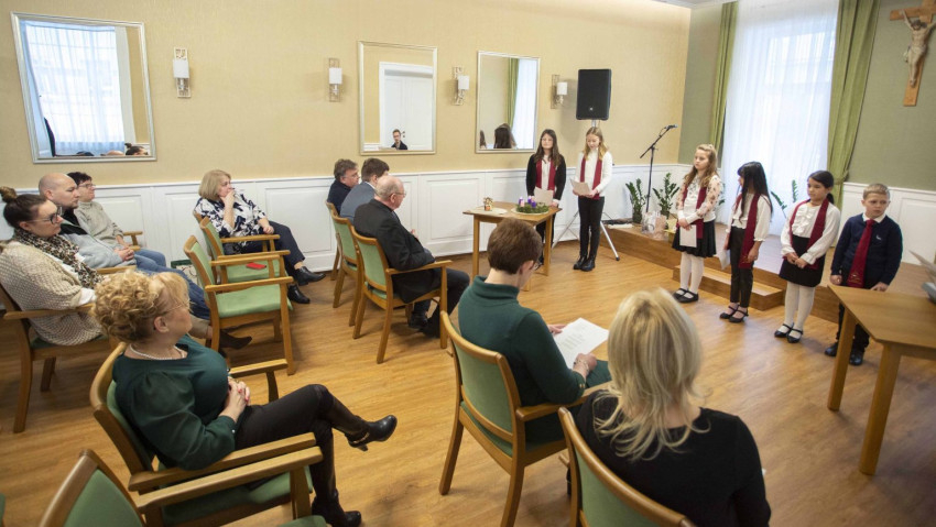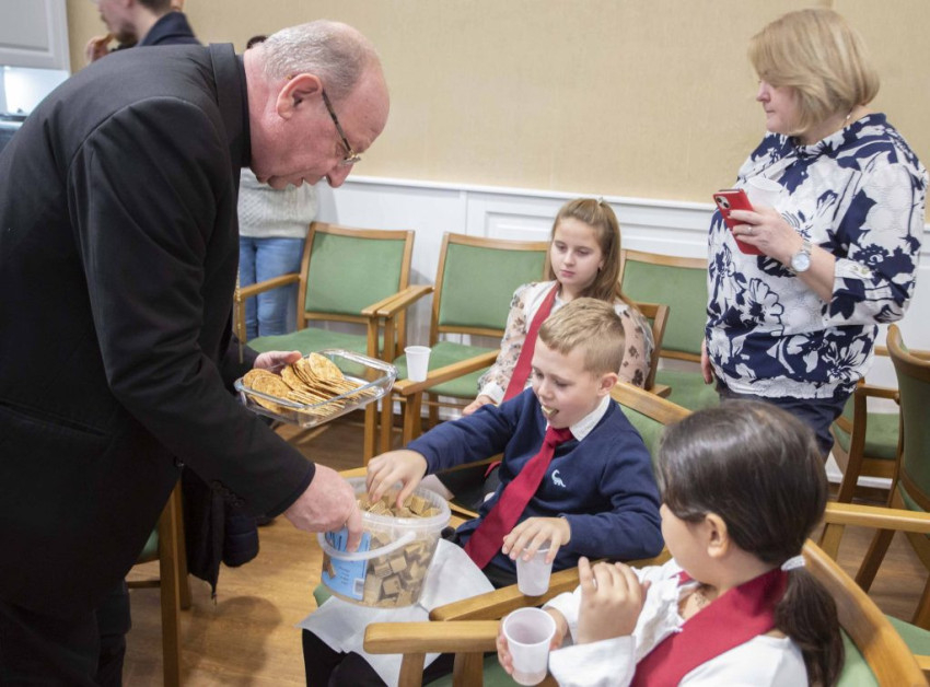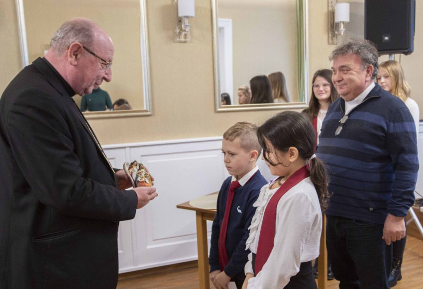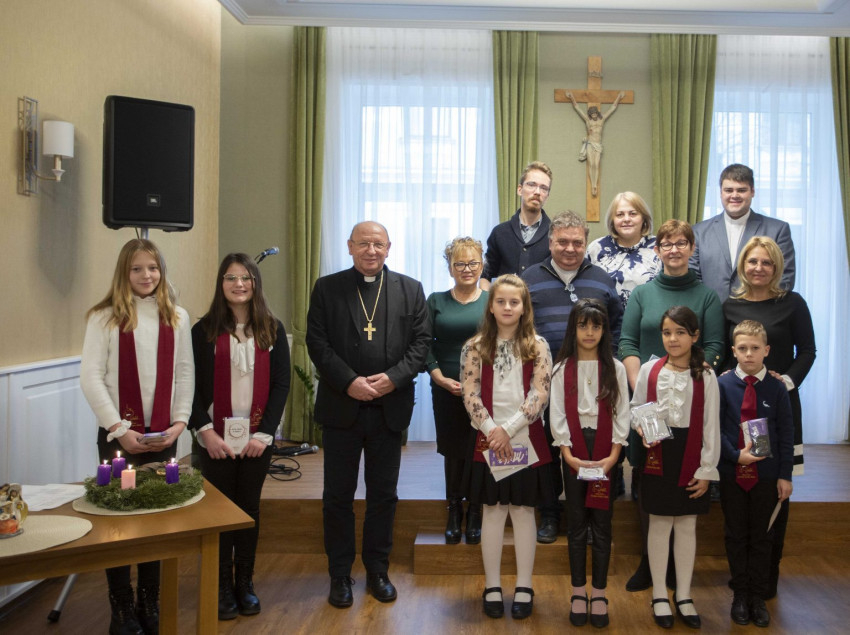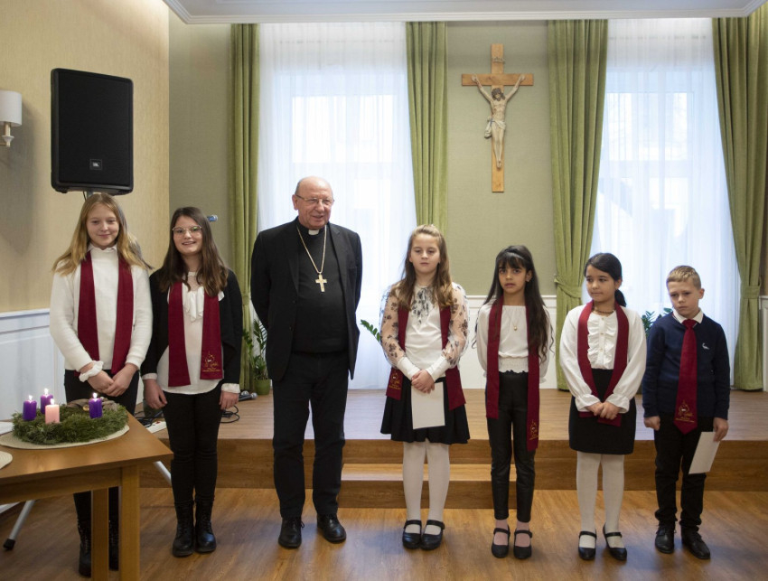 A kedves köszöntés után Palánki Ferenc püspök időt is ajándékozott a gyermekeknek, szeretetvendégségre hívta őket, hosszasan elbeszélgettek.