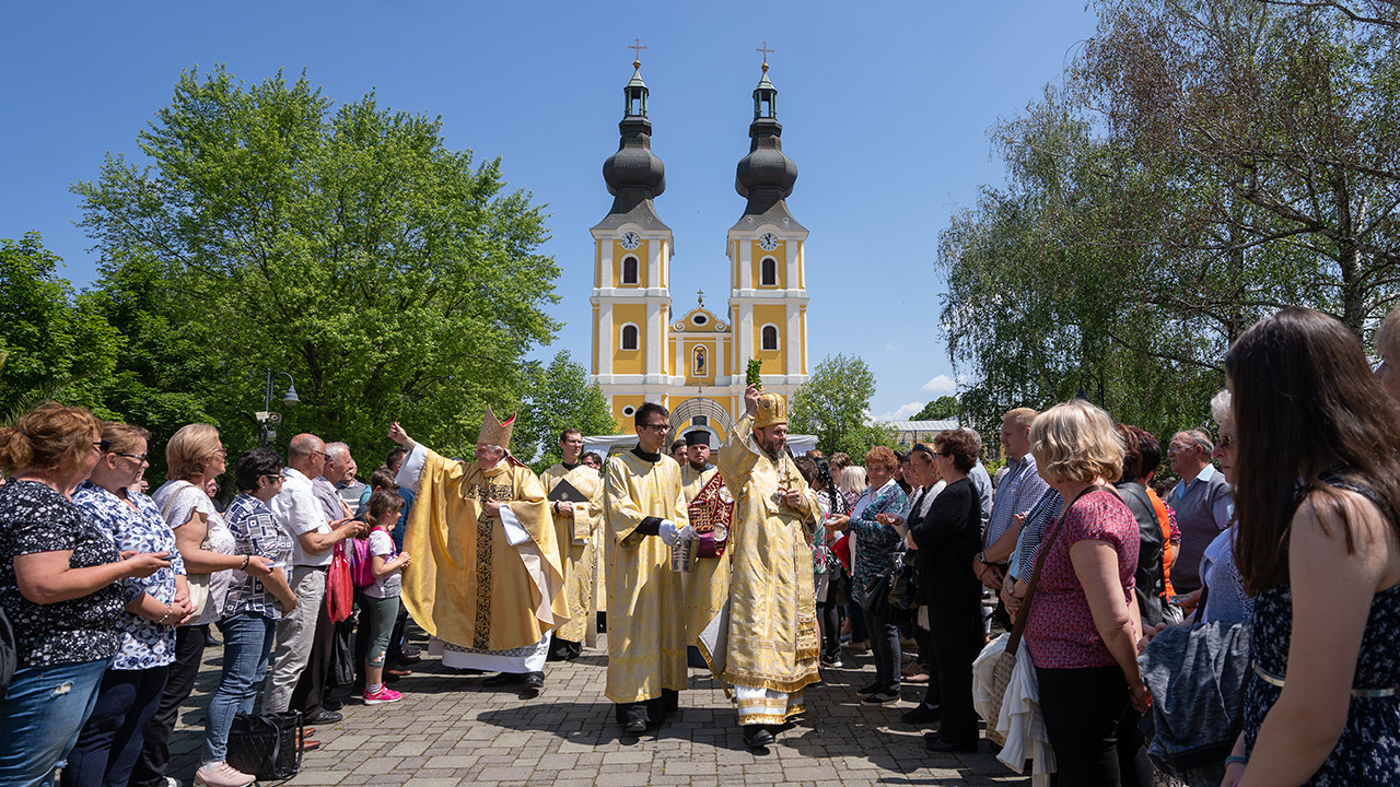 Az ünnepi Szent Liturgián az egyházmegye csaknem minden áldozópapja részt vett, arany-fehér liturgikus öltözékükben állták-ülték körül a templom előtt felállított szabadtéri oltárt, ahol Szocska A. Ábel megyéspüspök együtt celebrálta a liturgiát Michael Wallace Banach püspökkel, Magyarország apostoli nunciusával.