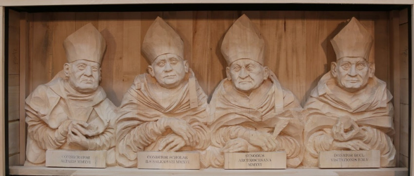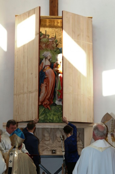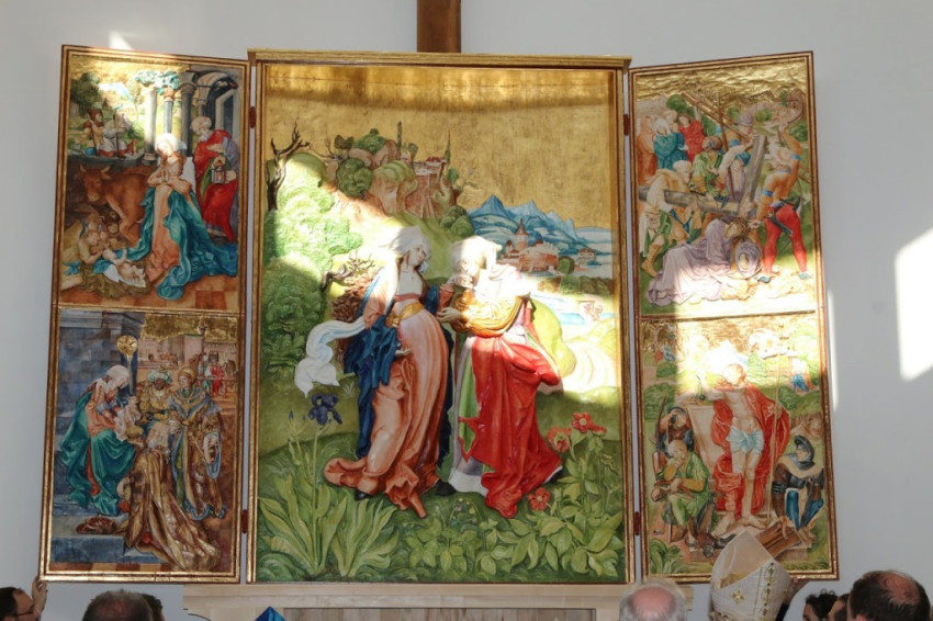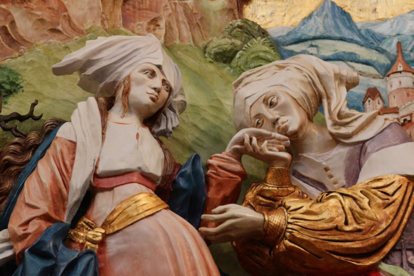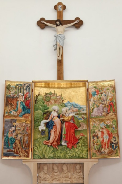 A középkori szárnyas oltárok stílusában készült alkotás központi festett domborműve Szűz Mária és rokona, Erzsébet találkozását ábrázolja.