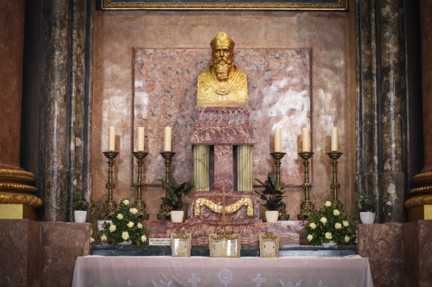 A székesegyház kereszthajójának északi oltárán, Franz Anton Maulbertsch hatalmas oltárképe alatt – amely Szent Márton csodatetteit örökíti meg –, a püspök mellszobrában nyert végleges elhelyezést az ereklye. Az idős főpásztor büsztjét a szombathelyi születésű Tóth István szobrászművész alkotta meg. A relikviát a püspöksüveg belsejében kialakított üregben helyezték el. A nagyméretű mellszobor szerencsésen átvészelte a háborús időket, gondos kezek idejében biztos helyre tették. Az ereklyét nem is bolygatták meg az elmúlt százhárom évben.