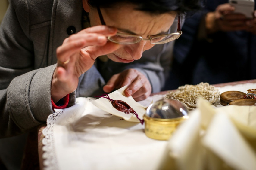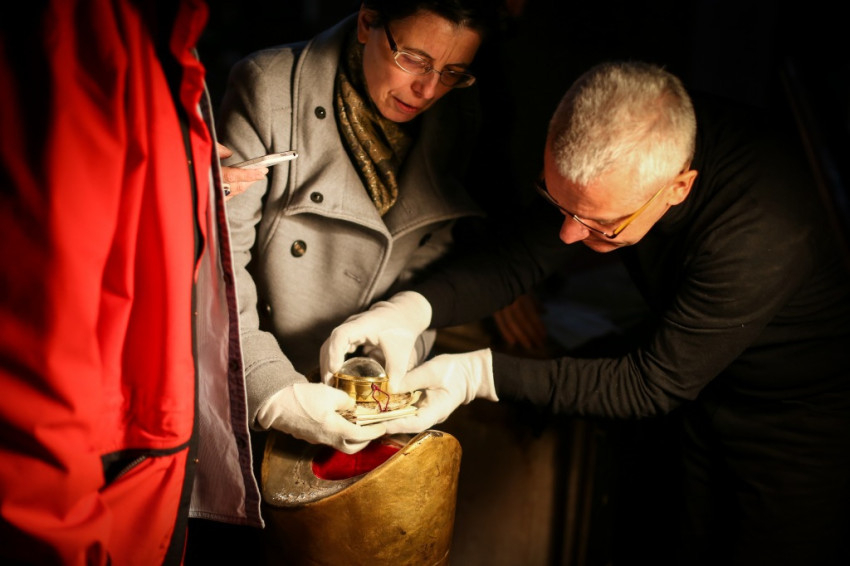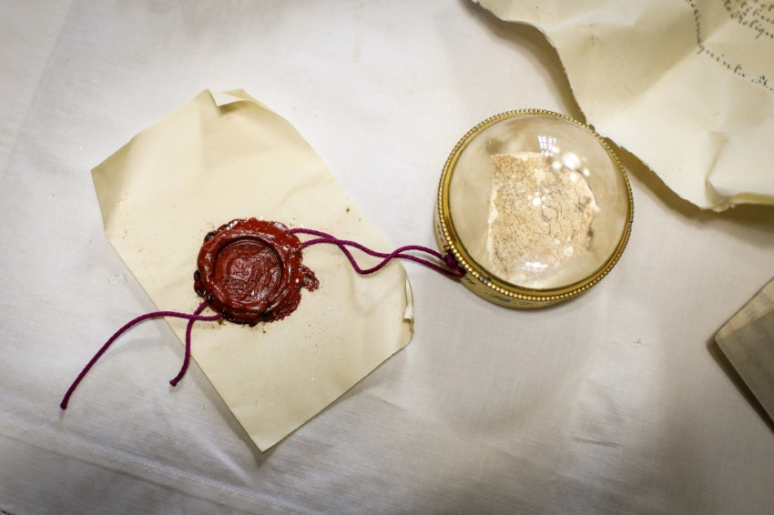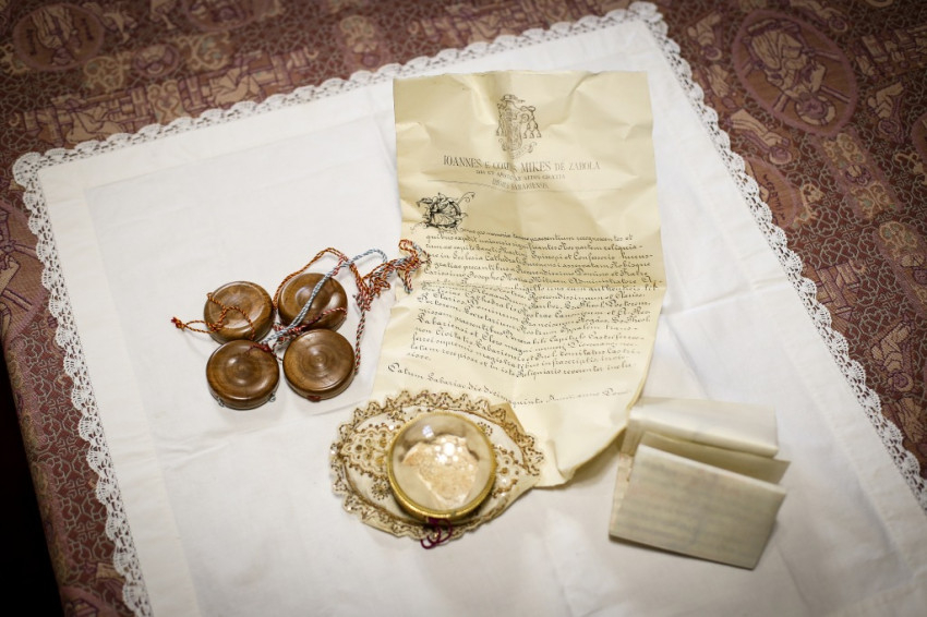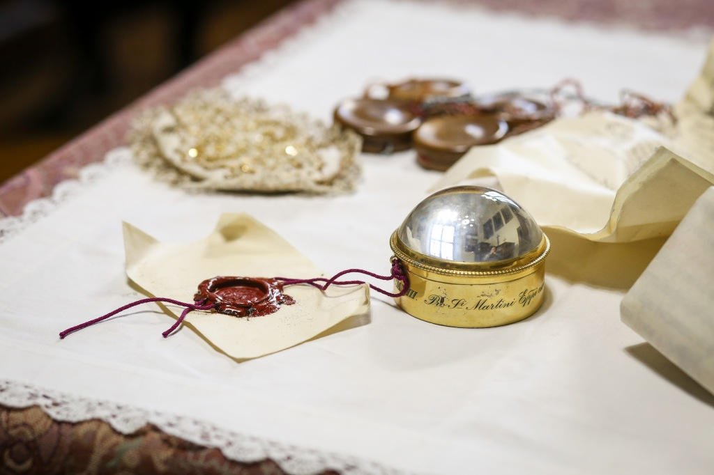 A vizsgálatra 2016. november 7-én került sor, amikor a hermából kiemelték az ereklyét tartalmazó fém szelencét és az alatta található két okiratot. Az egykori művész és mester munkája kiváltotta a jelenlévők elismerését: a püspöksüveg üregében vörös bársony fészekben nyugodott a kerek ereklyetartó a 4-5 centiméteres koponyacsonttal, melynek jobb megtekintését egy vastag nagyító üveg szolgálta. A szelence alatt aranyszállal és flitterekkel kihímzett terítő feküdt, mellette a keresett két hitelesítő okirat: az egyikben a tours-i érsek megbízottja igazolta a maradvány hitelességét és annak a tours-i Szent Márton-sírbéli ereklyéből való származását, a másikban Mikes püspök dokumentálta az emlék átvételét és annak a székesegyházban való elhelyezését. Ez utóbbi iratot négyen írták alá és négy függőpecsétet kötöttek a dokumentumhoz: Mikes János megyéspüspök, Horváth István, a vasvár-szombathelyi székeskáptalan nagyprépostja, Brenner Tóbiás polgármester és Herbst Géza, Vas vármegye alispánja.