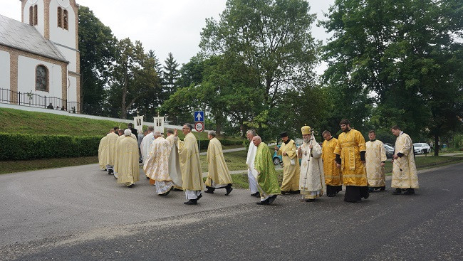 Szarka József parókus meghívására hazalátogattak azok a tisztelendő atyák is, akiket életútjuk ehhez a templomhoz köt. Ahogy annak idején, a papság most is díszes menetben vonult fel a dombon magasodó templomhoz.