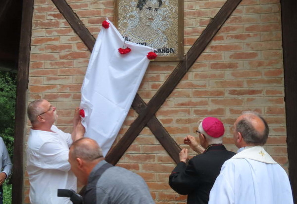 Perlaki György plébános a Károlyi Ferdinandát ábrázoló kép leleplezése előtt elmondta, az elmúlt években több ólomüveggel szépítették az árpádhalmi kápolnát, most pedig egy mozaikkép került a falára.