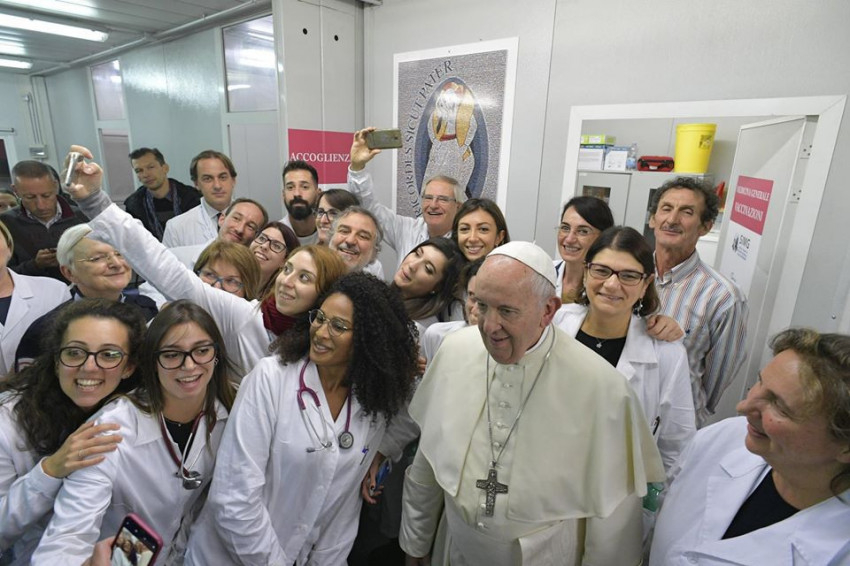 A pápa kifejezte, mily nagyra értékeli a gyorssegélyt nyújtó létesítményt. Köszönetet mondott az orvosoknak, az ápolóknak, akik önkéntesen végzik szolgálatukat, akár munkahelyi szabadságukat is erre áldozva.