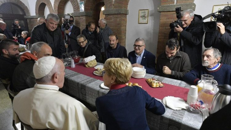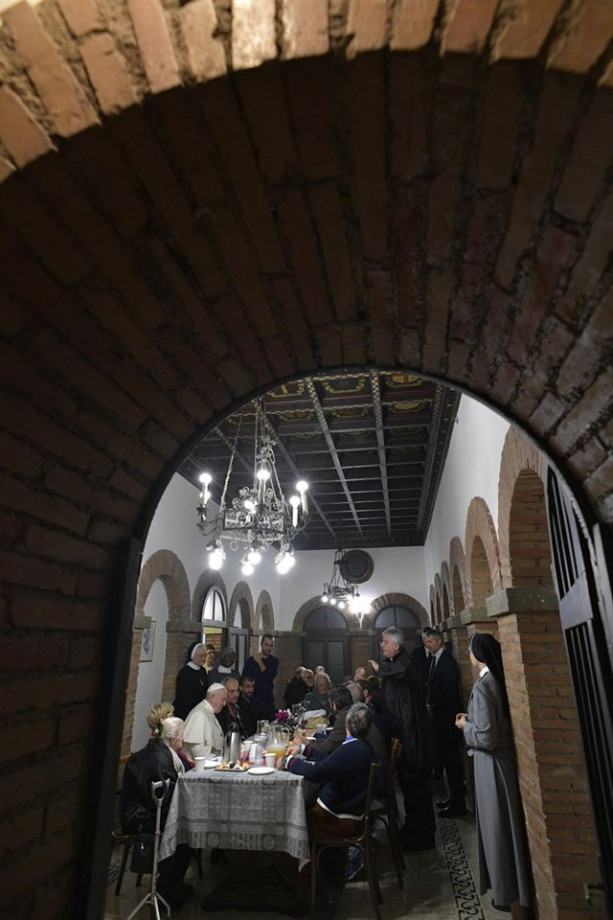 A látogatás alkalmából az Apostoli Alamizsnahivatal által felkínált szendvicseket, meleg italokat és édességeket szolgáltak fel. Ferenc pápa leült a hajléktalanok asztalához, meghallgatta történeteiket, bizalmas vallomásaikat.