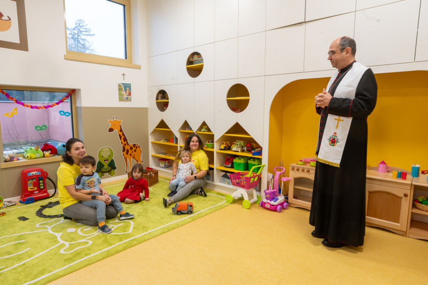 Ezt követően végiglátogatta a csoportszobákat, ahol megáldotta a gyermekeket és az óvodapedagógusokat. Isten áldását kérte az itt zajló nevelő munkára és az életükre.