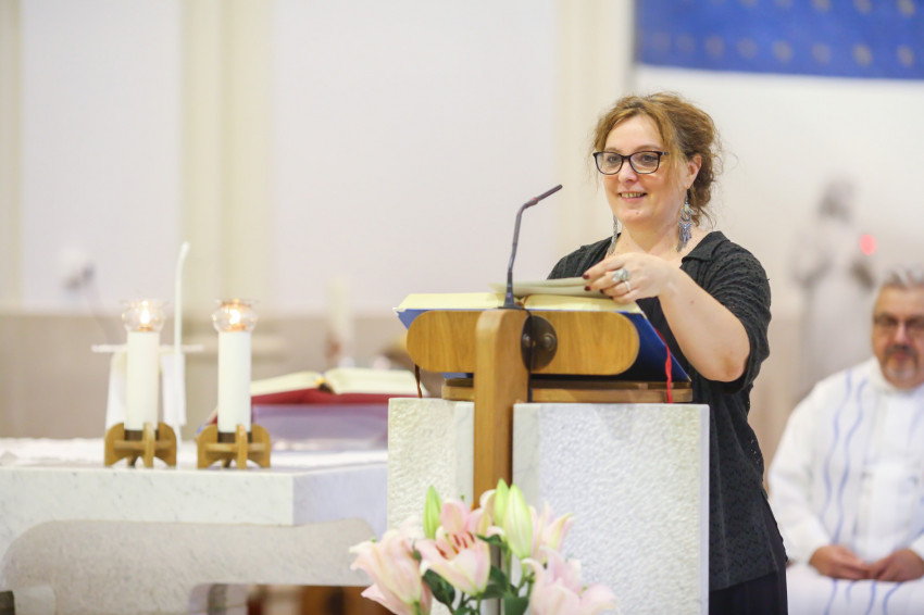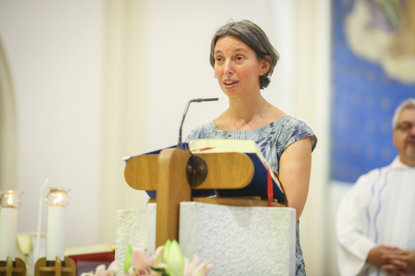 Az olvasmány és az evangélium felolvasása után Moldován Szilvia szólt először a felnőttekhez, aztán a gyerekekhez. A tanoda előzményei közt felelevenítette, hogy még évekkel ezelőtt Urbán József atyával azon gondolkodtak együtt, hogyan lehet teológiailag megalapozni azt, hogy egy iskolai közösség befogadó legyen, és megállapították, hogy a többségi társadalom felelőssége elmenni a peremre, behozni onnan a gyerekeket a központba, ahol a tudás és a döntéshozatal van.