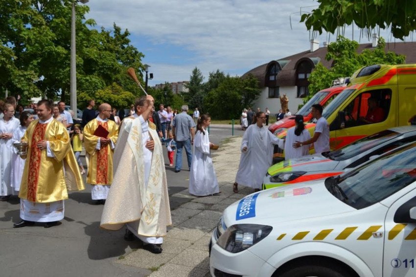 Ahogy különösen nemes szolgálatot végeznek önzetlen munkájukkal a mentősök, tűzoltók és rendőrök. Gyakran a Szentlélek-templom előtt elhaladva használják a megkülönböztető jelzésüket, ezért kérte a plébános a híveket, ezt a jelzést hallva fohászkodjanak a bajba jutott testvéreikért és az őket mentőkért. Az áldás szövegének elimádkozása után minden jármű megszólaltatta a szirénáját.