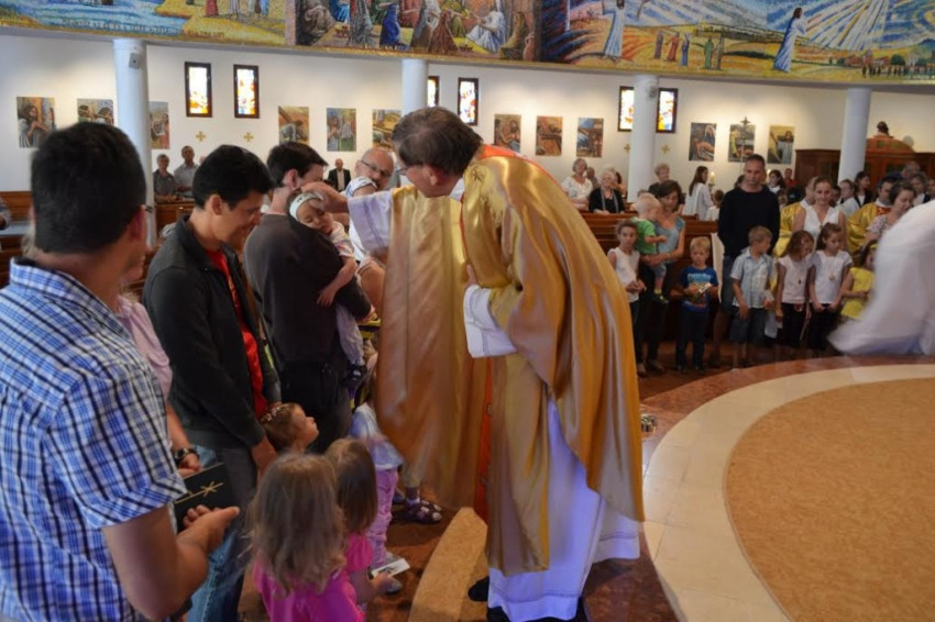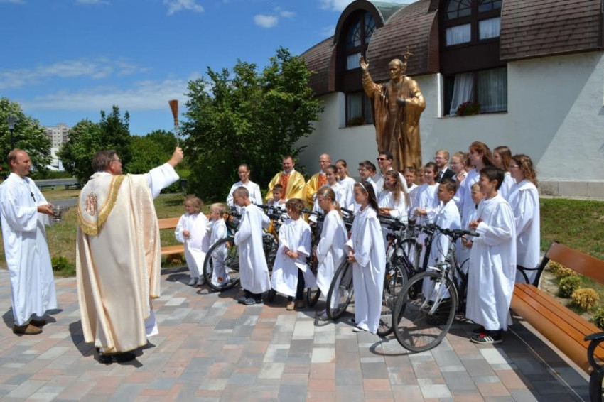 A ministránsok, akik közül sokan érkeznek az Úr házába szolgálatra kerékpáron, Szent II. János Pál pápa szobránál részesültek áldásban.
