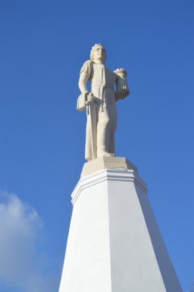 Kolozsi Tibor szobrász egy életerős és hitéért minden küzdelemre, áldozatra kész fiatal nőt álmodott meg, és a szentre jellemző attribútumokkal ábrázolta: egyik kezében a torony, másikban a kard – toronyba zárva nevelte apja, hogy megóvja a külvilág hatásaitól, karddal fejezte le, mert a kereszténység felvételétől nem tudta megóvni.
