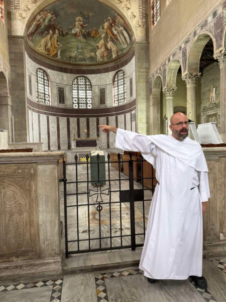 A coport vezetője itt Cristobal Torres Iglesias OP, a világi domonkosok promotora volt, aki májusban Magyarországon járt. Nagy szeretettel fogadta a csoportot, bemutatva nekik a bazilika páratlan, több évszázados kincseit. A bazilika Szűz Mária-kápolnája előtt énekelve együtt imádkozták a domonkos Salve Reginát, a domonkos család minden tagját, Egyházunkat és Magyarországot is Szűz Mária oltalmába ajánlva.