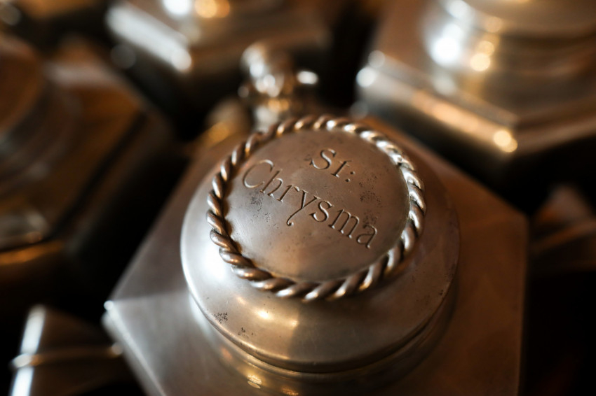 A homília végén állandó diakónusok hozták be a szentelésre előkészített olajokat a fémedényekben: a keresztelendők olaját, a szent krizmához való olajat és a betegek olaját. A keresztelendők olaját és a betegek olaját megáldotta a főpásztor, a krizmához való olajat pedig megszentelte.