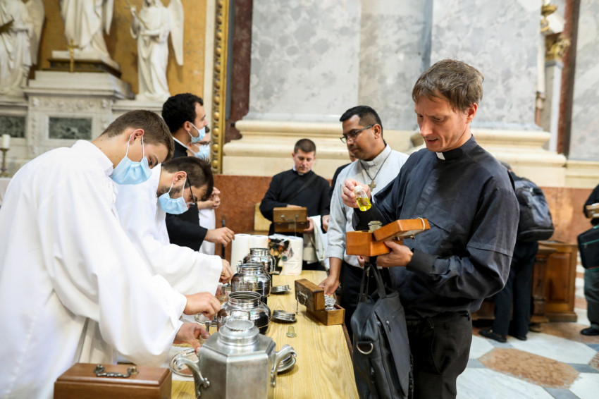 Az áldást követően a diakónusok, a papság, a püspökök és a főpásztor ünnepélyes kivonulás keretében vitték a megáldott és megszentelt olajokat.