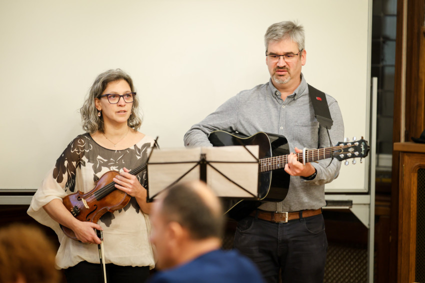 A könyvbemutató alaphangját kollégáink, Nádudvari Dorottya és Lambert Attila adták meg, elénekelték Franco Zeffirelli Napfivér, Holdnővér című kultikus filmjéből a Szól az édes madárdal című éneket: „Szól az édes madárdal / A zöldellő lombok alatt / Selymes szellő simogat/…Virágok közt járni jó /… Bár lenne a fény örök, / Az élet ma pezsgő öröm, / Béke legyen mindenkivel / E kedves napon.”
