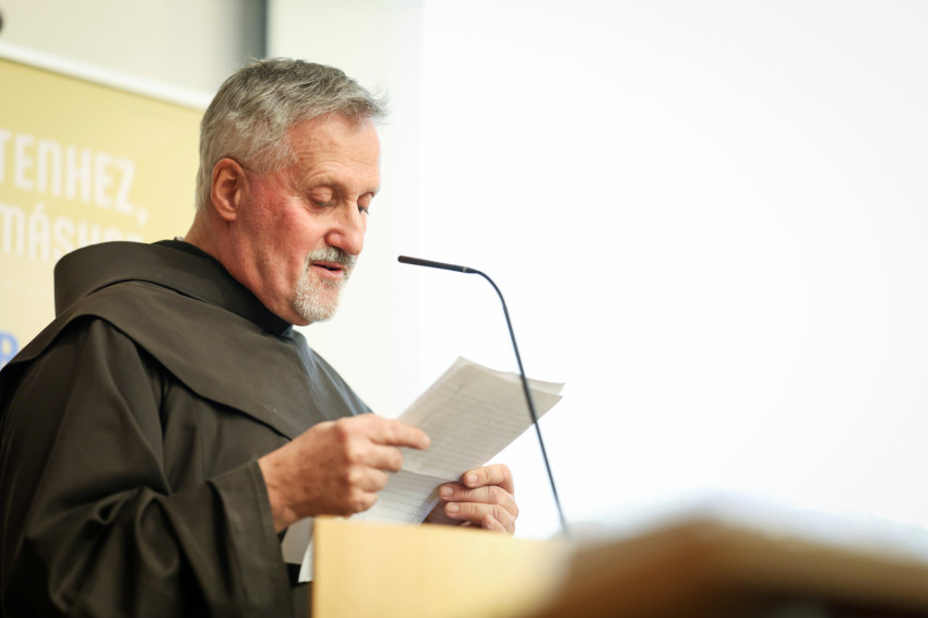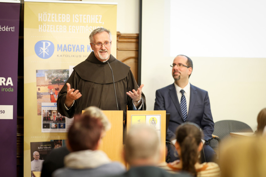 Bécser Róbert OFM harminc évig tanított három ferences gimnáziumban, mindháromnak az igazgatója is volt. A könyvbemutatón Szent Ferenc nyomában címmel tartott előadást. Felidézte: a ferences gimnáziumokban hagyomány, hogy az érettségi előtt álló tizenkettedikeseket búcsúkirándulásra elviszik Assisibe. Ő maga 25–30 alkalommal járt Szent Ferenc szülővárosában. A fiatalokat azonban nem könnyű ráhangolni a zarándoklatra, ezért is beszélt arról, mi a különbség a turista meg a zarándok között. A turista vásárló, aki szeretne a pénzéért ár-érték arányban minél többet kapni. A középpontban önmaga van, hiszen ő az, aki élvezi a helyzetet, szelfizik, odaáll a medve elé is, ha kell, az életét is kockáztatja, hogy valami izgalomban legyen része, fölteszi a képet az internetre, alig várja, hogy lájkolják. Ezzel szemben