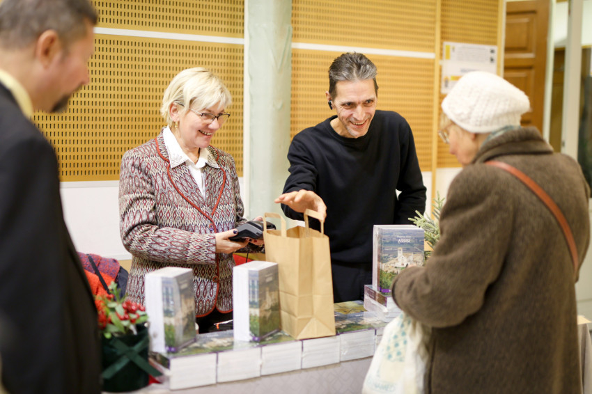 A könyvet Szalai Gábor, a budapesti Szent Angéla Ferences Iskola és Gimnázium igazgatója mutatta be. „Béke és jóság” – ezzel a ferences köszöntéssel üdvözölte a hallgatóságot. Izgalmasnak nevezte, hogy miért éppen Assisiről és Szent Ferencről szól ez az útikönyv. Szalai Gábor sokat beszélgetett erről Kuzmányi Istvánnal, hiszen a kötet az eredeti terv szerint rendalapítókról szólt volna, Ferenc mellett Nursiai Szent Benedek és Casciai Szent Rita is belekerült volna a könyvbe. Munka közben kiderült azonban, hogy egyre több az anyag Szent Ferencről, az általa látogatott helyekről, és ez kitölt egy könyvet, olyannyira, hogy több magyar vonatkozású téma bele sem fért, terjedelmi okok miatt. Az iskolaigazgató idézte Székely János püspököt, a Magyar Katolikus Püspöki Konferencia elnökét, aki a könyvhöz írt ajánlásában felidézte gyermekkori élményét a betlehemállításról. Ez ráirányítja a figyelmünket, hogy Szent Ferenc élete, tettei mennyire aktuálisak ma is. Szalai Gábor másodikos fia is lelkes szereplője lesz nemsokára egy betlehemezésnek.