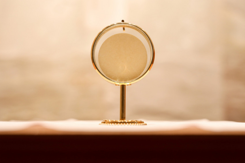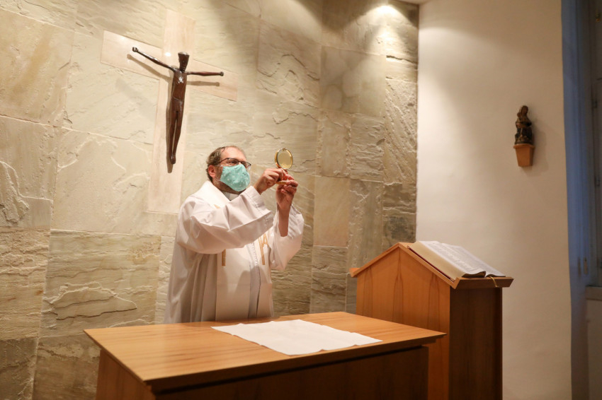 Oltárra kihelyezett szentelt ostya, a szenvedés és a feltámadás között „lebegő” modern korpusz, nyitott Szentírás, mély csönd, hívő férfiak és nők – éppen tizenketten, Jézus jelenlétében elmerülve.