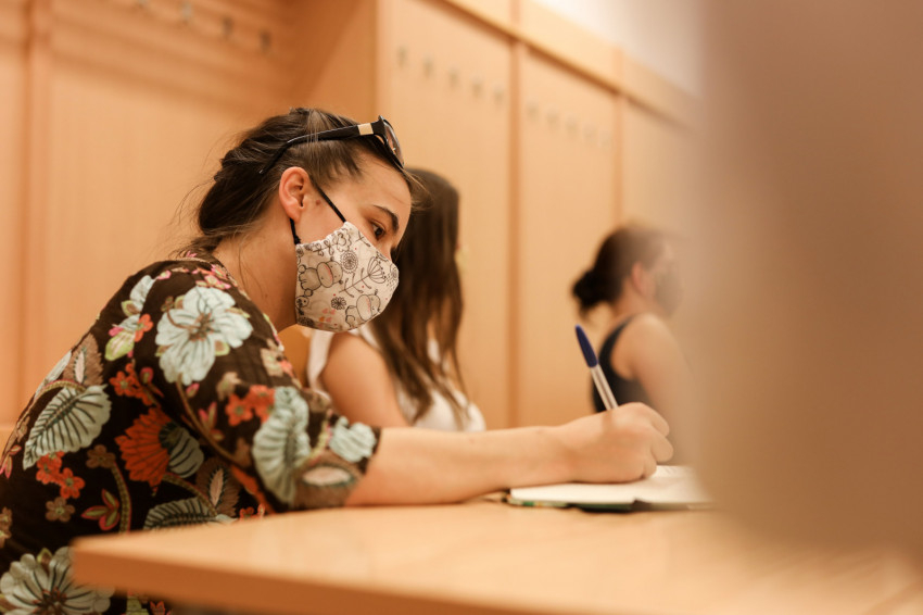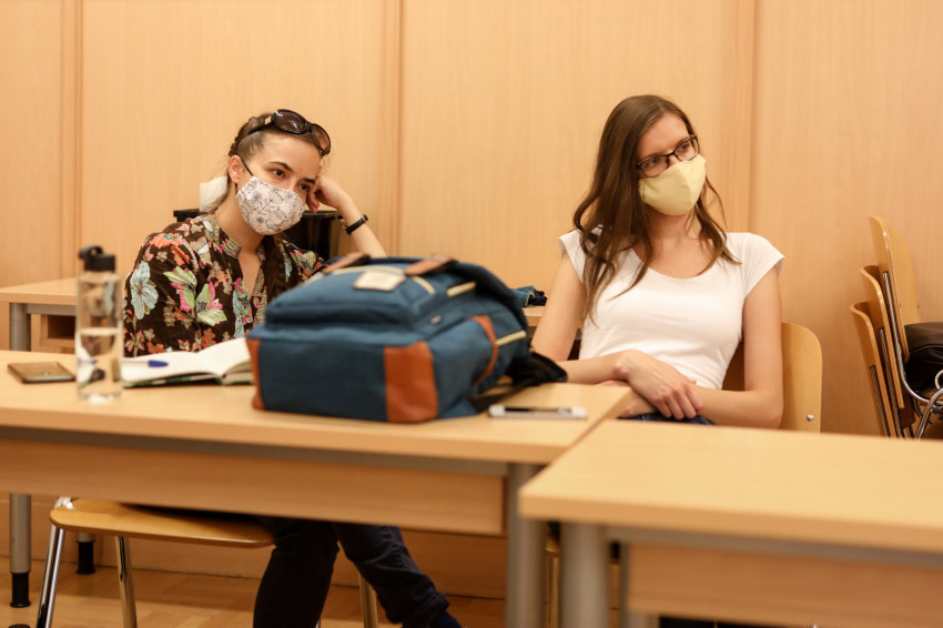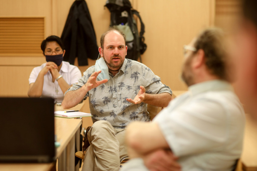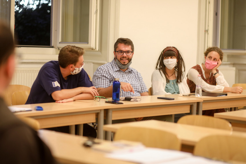 A kurzus évkezdő alkalma a „B” teremben folytatódik. Oda már többen érkeznek; ketten online kapcsolódnak a közösséghez Nobilis Márió laptopjának segítségével.