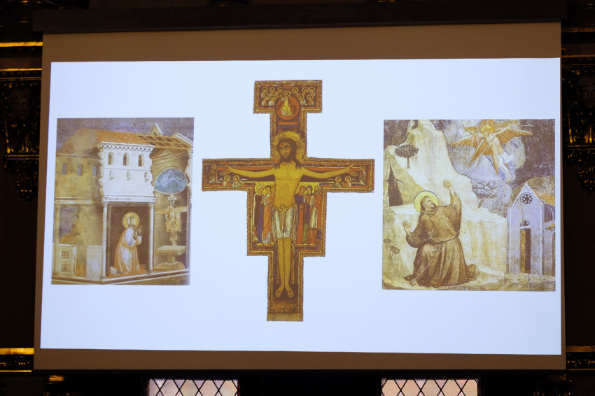 Az előadó emlékeztetett rá: a Naphimnusz írásakor Ferenc már nem látott, a fényt is alig érzékelte, mégis beszélhetünk a tekintetéről. Ez az a lelki habitusa, hozzáállása, amivel maga köré tekint. Ez a tekintet érzékeny a teljes teremtésre, a teljes kozmogóniára, a halálhoz való barátságos viszonyra; és a megfeszített, sebhelyes Krisztusra irányul. Ferenc a feszületet „szívta magába” a megtérése után.