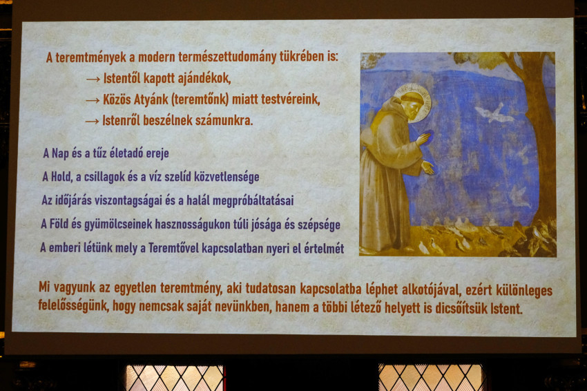 Mészáros Lukács biológiatanár, az ELTE őslénytani tanszékének oktatója A teremtmények missziója: Mit mond a mai természettudós számára egy 13. századi himnusz? címmel tartotta meg előadását. Kifejtette: azt a szellemi mátrixot, amelyben Szent Ferenc megalkotja a Naphimnuszt, nemcsak egy nyolcszáz éves, hatalmas szakadék választja el mai gondolkodásunktól, hanem paradigmaváltásokkal tarkított, néha rohamosan felgyorsult fejlődés is, ami elvezetett a jelenkori tudományhoz. Ugyanakkor mai tudományos szemléletünk evolúciós alapokon áll, és ökológiai szemléletű.