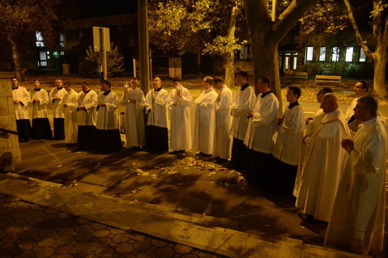A szentmise után közvetlenül ünnepi matutinum, vagyis olvasmányos imaóra kezdődött, amelynek olvasmányai még inkább segítettek minket megérteni Szent Imre nagyságát és életszentségét. Lélekemelő volt a Szent Imre-plébánia közösségével együtt imádkozni, együtt ünnepelni. Megemlékezésünk zárásaként, a hívekkel együtt helyeztük el mécseseinket a magyar ifjúság védőszentjének szobránál, amely a templom bejáratánál várja a betérő imádkozni vágyókat.