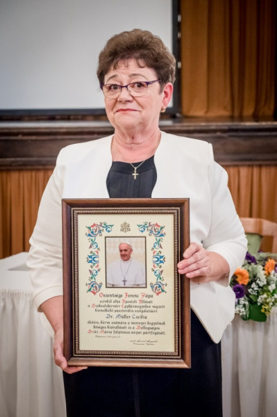 Ferenc pápa apostoli áldását adta Dr. Müller Cecíliára a Székesfehérvári Egyházmegyében végzett kiemelkedő pasztorális szolgálatáért. Az áldást Spányi Antal püspök tolmácsolta.