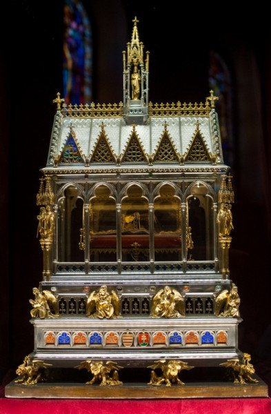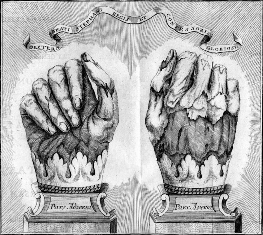 Szent István király kézereklyéjének története a 11. századra nyúlik vissza. Istvánt 1038-ban Fehérvárott helyezték végső nyugalomra, ám a halálát követő trónviszályok miatt a káptalan – félve a holttest megszentségtelenítésétől – a Nagyboldogasszony-bazilika közepén álló márványszarkofágból áthelyeztette a bazilika alatti sírkamrába. Hartvik püspök legendája szerint ekkor választották le a mumifikálódott jobb kezet, mivel csodás erőt tulajdonítottak neki. A kincstár őre, Merkur őrkanonok azonban – ahogy később, felelősségre vonásakor állította – egy angyal megbízására „eltulajdonította”, majd a birtokán elrejtette az ereklyét. Arra hivatkozott, hogy a zavaros időkben biztonságos helyen akarta őrizni.