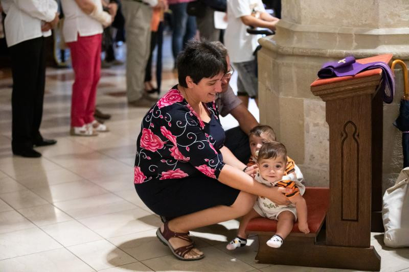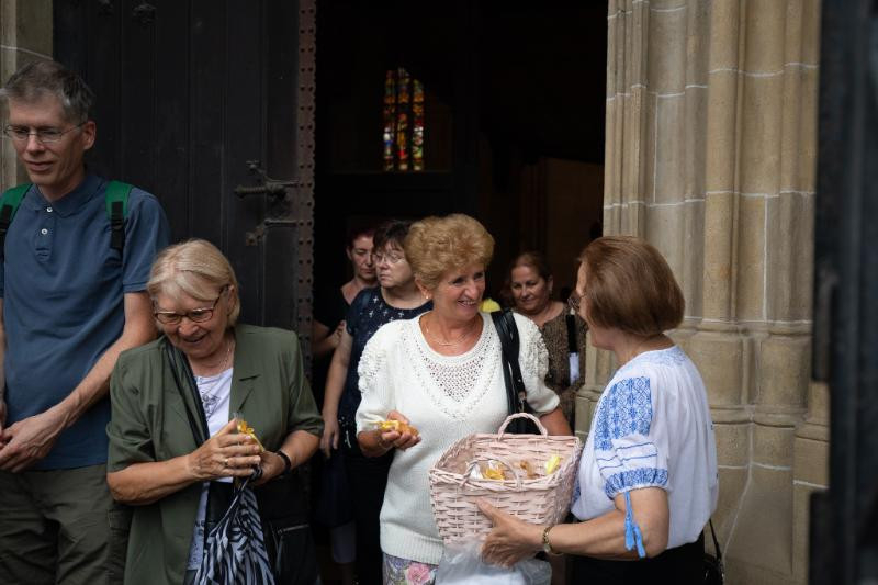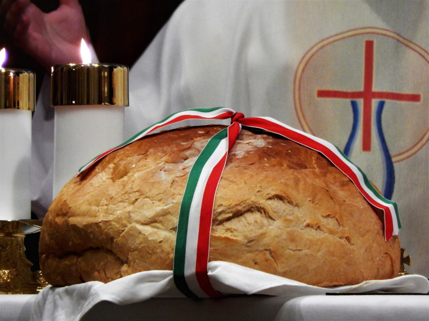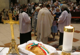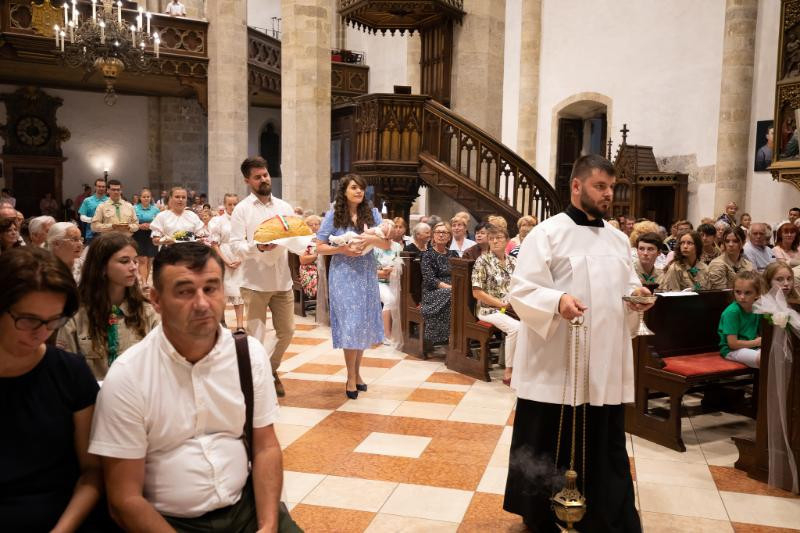 A szentmise talán legszebb része volt a felajánlás, mikor népviseletbe öltözött lányok, cserkészek, valamint a tavalyi budapesti eucharisztikus kongresszus önkétesei vonultak végig a szentély felé az adományokkal és az új kenyérrel. A menetet egy fiatal pár vezette, akik újszülött gyermeküket vitték az oltárhoz.