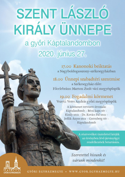 Szent László király ünnepén, június 27-én, szombaton 17 órai kezdettel kanonoki beiktatásra kerül sor a győri Nagyboldogasszony-székesegyházban, majd az ünnepi szabadtéri szentmise 18 órakor kezdődik a székesegyház előtt Marton Zsolt váci megyéspüspök főcelebrálásával.