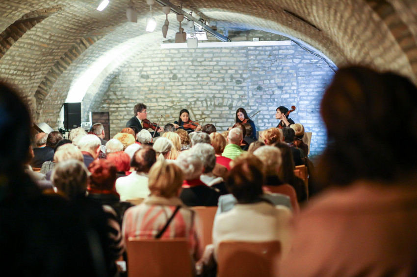 A belépéskor felébred a kétely, vajon hol fért el ez a rengeteg műtárgy, be tudja-e fogadni a galéria a látogatósereget, és hogyan tartanak itt koncertet a Concerto Budapest művészei. A folyosóról ugyanis csak egy kisebb terem, onnan pedig még egy hasonló méretű nyílik. A vendéglátók azonban megnyugtatnak: az aprócska udvarról a galéria másik szárnyába juthatunk, ahol a hosszú kiállítófolyosó végén jobbra és balra tágas boltíves termek találhatók. Az egyikben folytatódik a tárlat, a másik pedig erre az estére koncertteremmé válik.