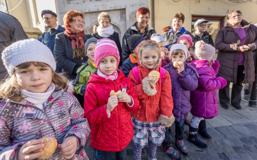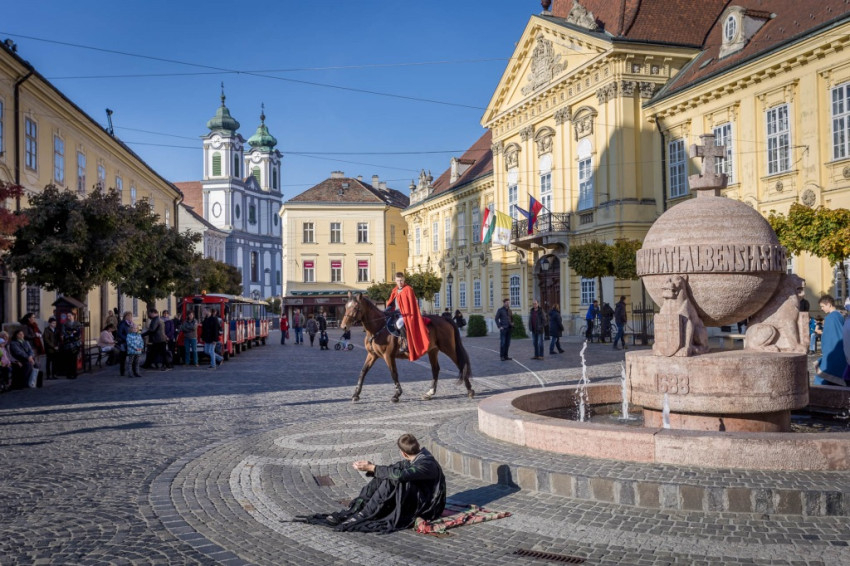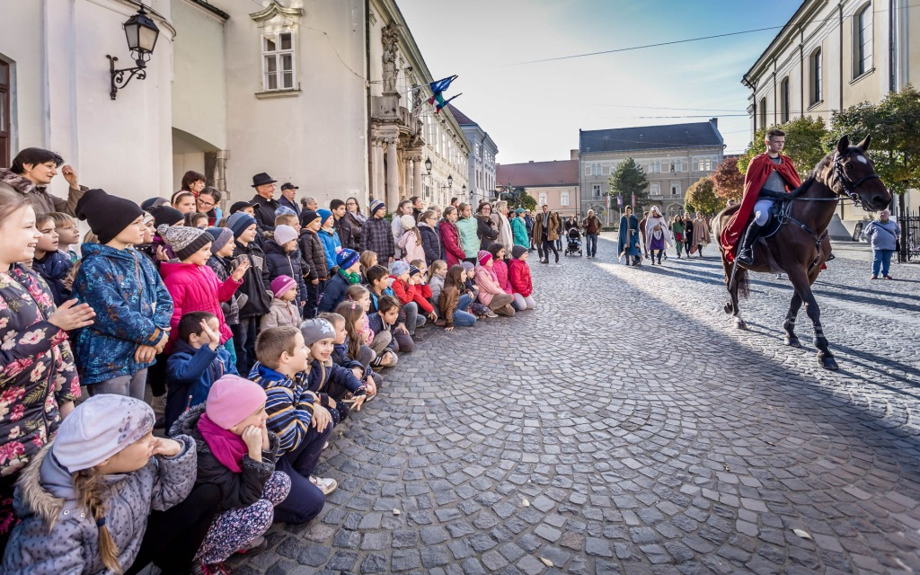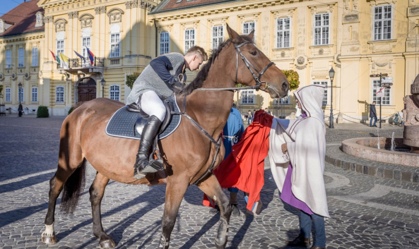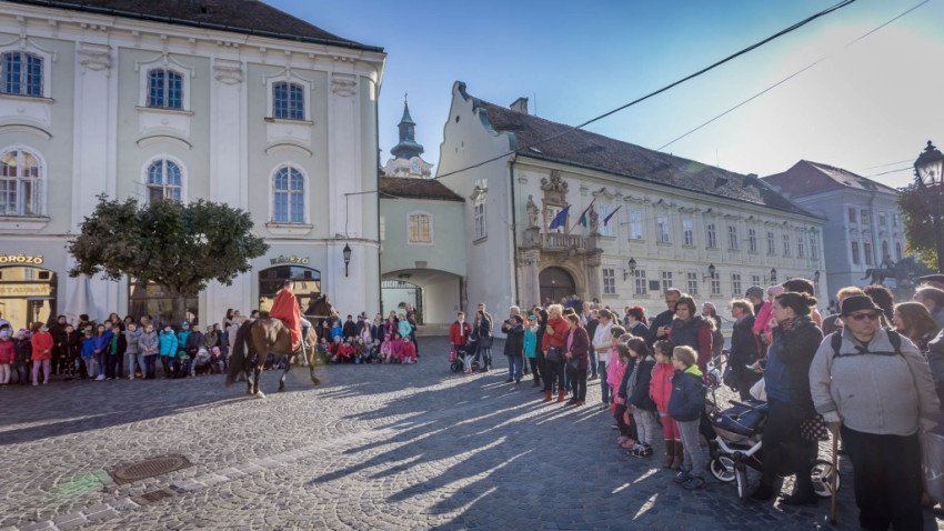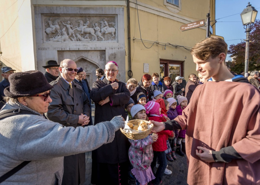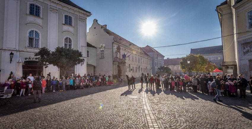 Az ünnepség a Szent Márton megosztja köpenyét című performance-szal kezdődött. A város központjában sok gyermek volt kíváncsi a Ciszterci Szent István Gimnázium diákjainak jelenetére. Fanfárok kíséretében érkezett meg Márton, aki lóháton járta körbe a belvárost. A főtéri templom oldalán álló keresztnél imádkozott, majd meglátta Krisztust az utcán kéregető koldusban. Palástját kettészakította, és betakarta a didergő embert. Ezután a színjátszókörösök jelmezekbe öltözve, „alamizsnát” osztogatva idézték meg az ókori Pannóniát a belvárosban.