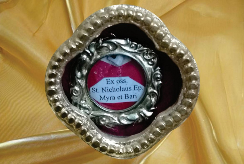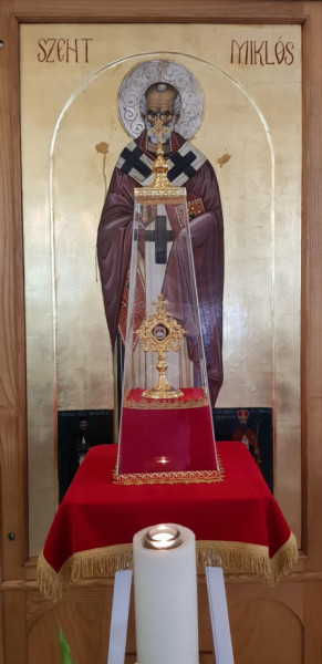 Az ereklyét zárt tartóban a Szent Miklós-ikon előtti, ez alkalomra készített emelvényre helyezték, hogy bárki szemlélhesse, előtte imádkozhasson. Immár két Szent Miklós-ereklyét is őriz – a főoltárban és az ajándékba kapott díszes ereklyetartóban – a szatmári görögkatolikus egyházközség, melynek első templomát 1690-ben Johannes Josephus De Camillis püspök szentelte fel e helyen Szent Miklós főpap tiszteletére.