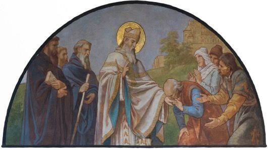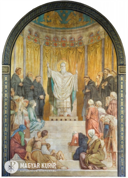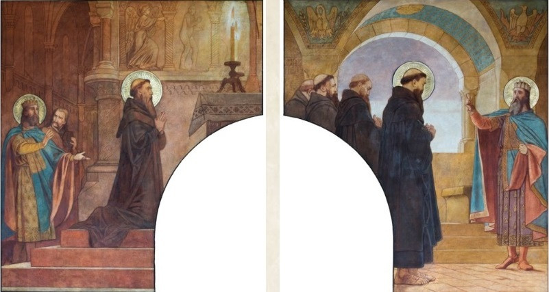 Szent István király és fia, Imre herceg Pannonhalmára látogatnak. Fogadásukra előresietnek a szerzetesek, a háttérben az apátság épülete látható. Imre a szerzetesek közül kiemelt tisztelettel köszönti Mórt, akit hét csókkal illet. Később apja kérésére elmondja, hogy érdemeik alapján üdvözölte a szerzeteseket, akik közül Mór az első.