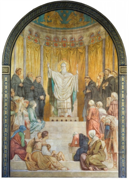 Az utolsó falképeken ismét pécsi eseményeket láthatunk. Az 1064-es tűzvészben elpusztult templomot Mór püspök szenteli fel a helyreállítás után. A kápolna keleti falát betöltő Szent Mór prédikációja oltárkép a ciklus legnagyobb darabja. A szentélyben szerzetestestvérei veszik körül, míg a világiak csoportja a lépcsőkön ülve, vagy meghajolva hallgatja a szent püspököt.