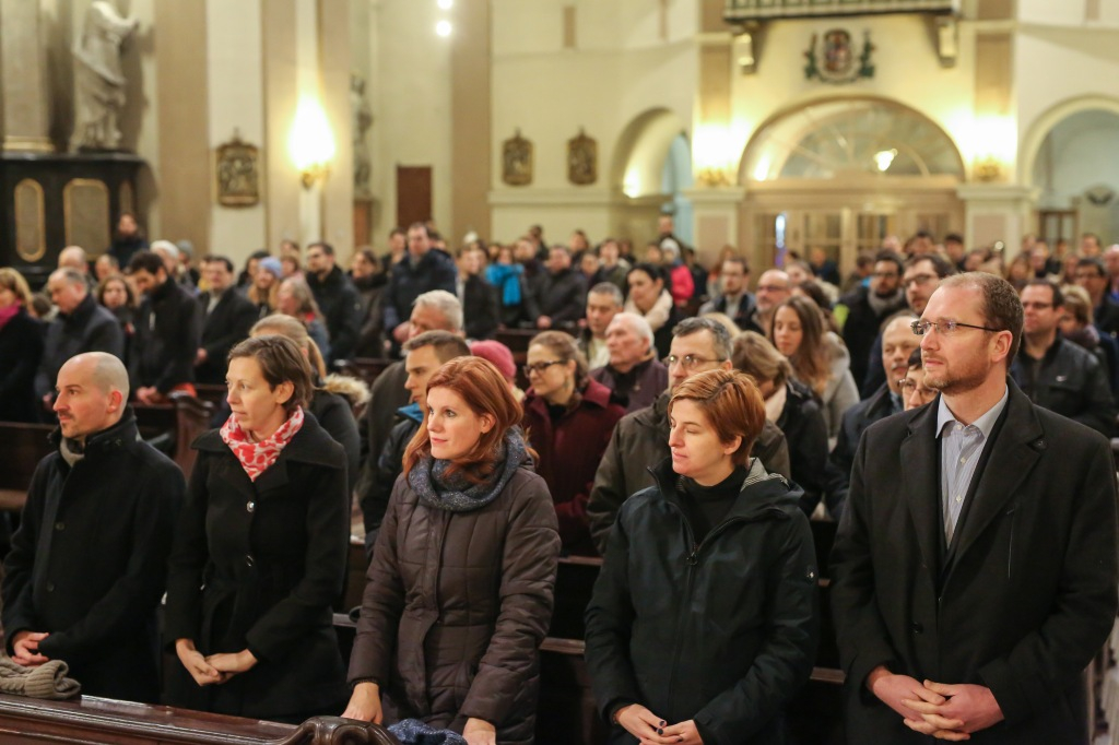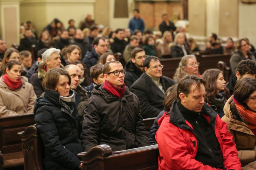 Egy darabig az oldalfolyosón álldogálunk. Nagy a forgalom, az érdeklődés: a szerelmesek napja, illetve meghívása ma estére érzékelhetően sokakat megihletett. Egy pár mellettünk éppen megismerkedése történetét meséli valakinek, egy hatvanas úr pedig aggodalmasan érdeklődik, hogy jókor érkezett-e a „szerelmesmisére”. Lelkesen zsibong a templom és a környéke.