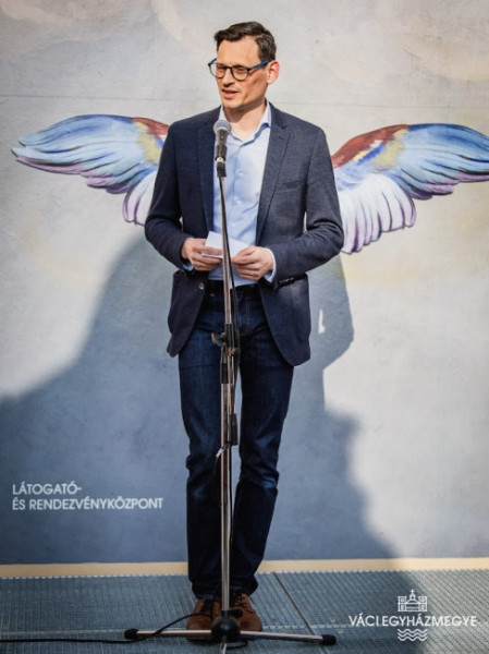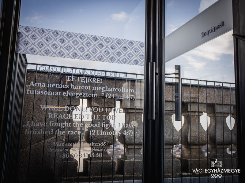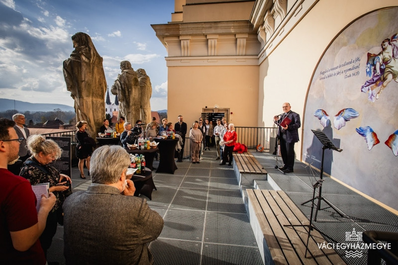 A váci székesegyház árkádjai fölött a 25 méter magasban található teraszon gyülekeztek a meghívott vendégek, ahol egy rövid barokk zenei bevezetőt követően Marton Zsolt váci megyéspüspök köszöntötte Az ég veled! című, a váci Nagyboldogasszony-székesegyház tornyában kialakított állandó kiállítás megnyitóján megjelenteket.