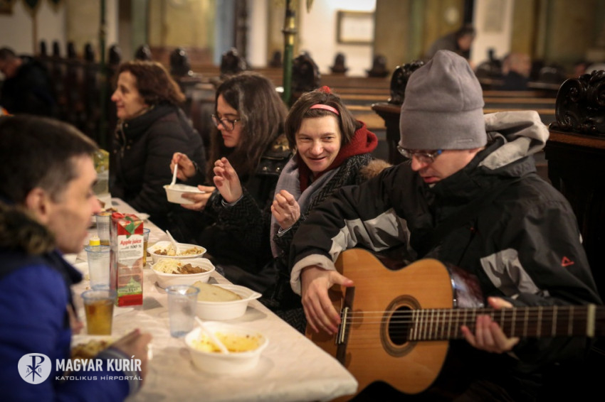 A szentmisét követően az eucharisztia asztala az irgalmas szeretet asztalává vált, a templomban asztalokat terítettek a szegényeknek, mintegy száz embernek. Mohos Gábor püspök is ott maradt az asztalnál beszélgetni a vendégekkel. Fiatalok, budapesti gimnazisták többek között az Apáczai- és a József Attila-gimnáziumból, egyetemisták, dolgozó fiatalok, a közösség tagjai és barátaik szolgáltak fel a vacsoránál. A közösség rendezvényein az étkezés azáltal igazán családias, hogy együtt fogyasztják el, beszélgetnek egymással utcán élők és mindazok, akik hetente látogatják őket, barátként, szinte családtagként tekintenek egymásra.