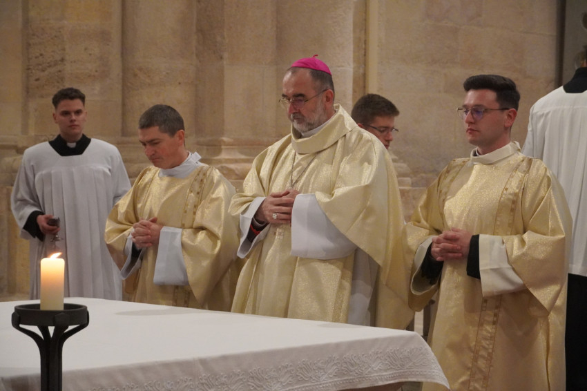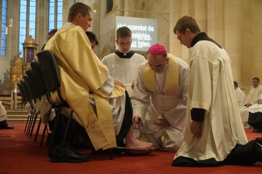 Román, magyar és német nyelven elmondott homíliájában Johann Dirschl általános helynök felidézte az Eucharisztia megalapítását, amit Jézus az apostolaira bízott a halála előtti utolsó közös vacsorán. „Szent János evangélista beszámol arról, hogy Jézus egy másik utat is megmutatott: a szeretet útját. Jézus ugyanis »levetette felsőruháját, fogott egy vászonkendőt, és maga elé kötötte. Aztán vizet öntött egy mosdótálba, majd hozzáfogott, hogy sorra megmossa, s a derekára kötött kendővel megtörölje tanítványainak a lábát.« Jézus korában ezt a munkát a szolgák végezték a házba érkező vendégekkel; egy rabbi vagy tanító aligha mosta meg a tanítványai lábát. A végén Jézus így szólt: »nektek is meg kell mosnotok egymás lábát«. A Megváltó ezzel olyan szeretetre hív, amely nem vár viszonzást.