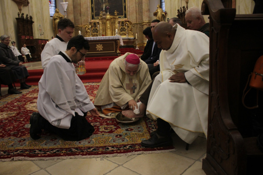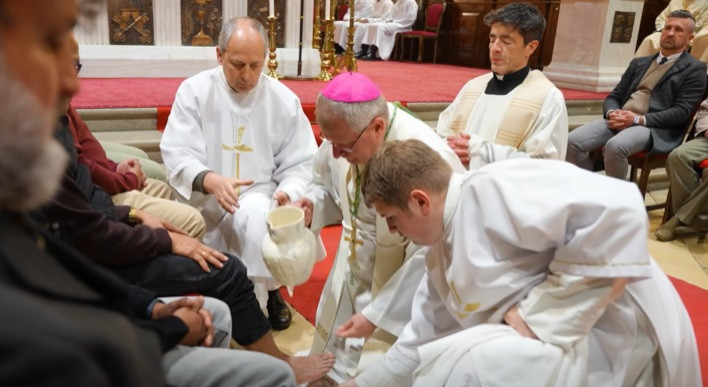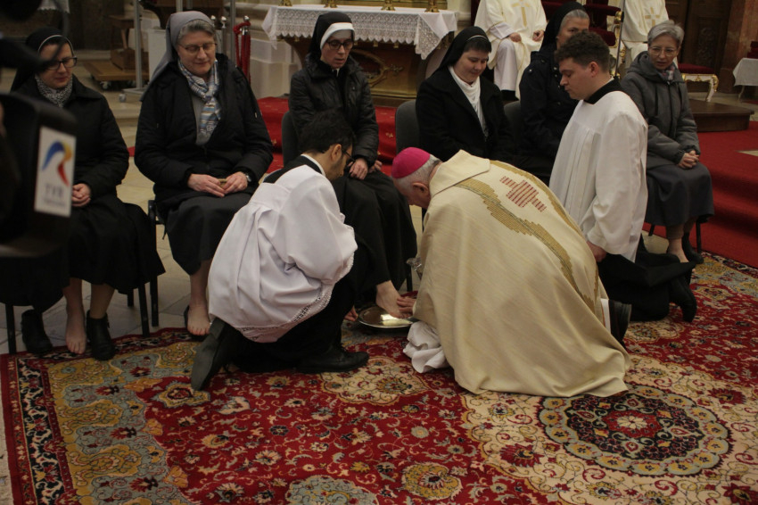 A prédikáció után a püspök a lábmosás szertartásában Jézus példáját követve megmosta a kiválasztott hívek lábát.