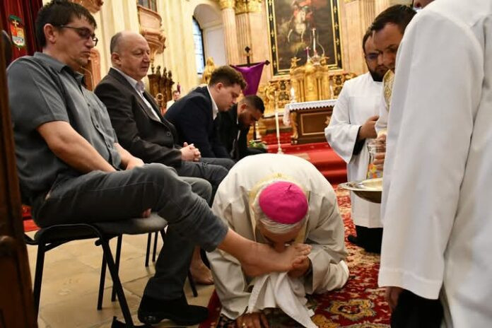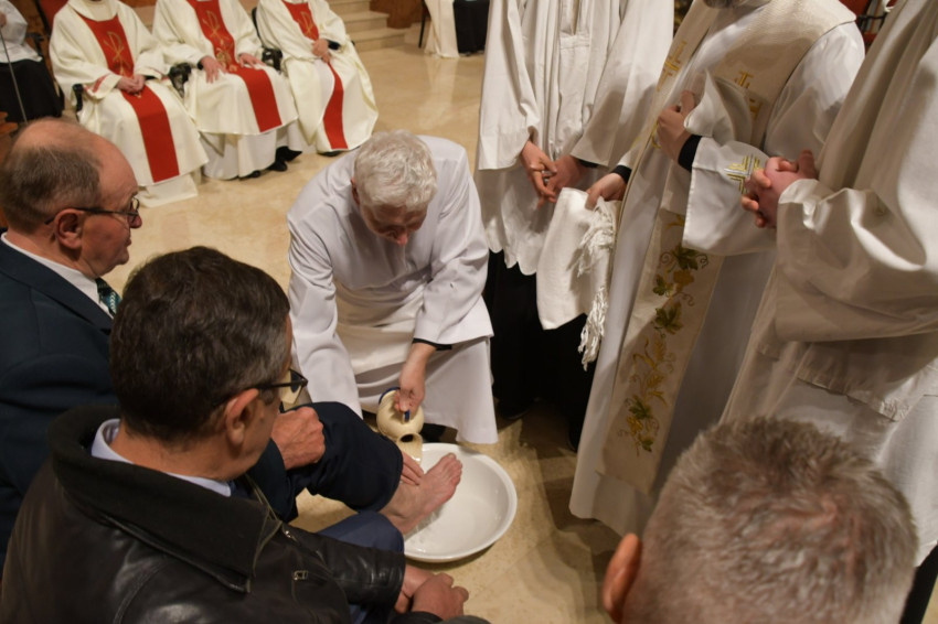 A prédikációt követően Fazekas Ferenc a lábmosás szertartásában Jézus példáját követve, megmosta a kiválasztott hívők lábát. A tizenkét apostolt megszemélyesítők között voltak az egyházmegye különböző plébániáihoz tartozó férfiak.