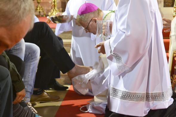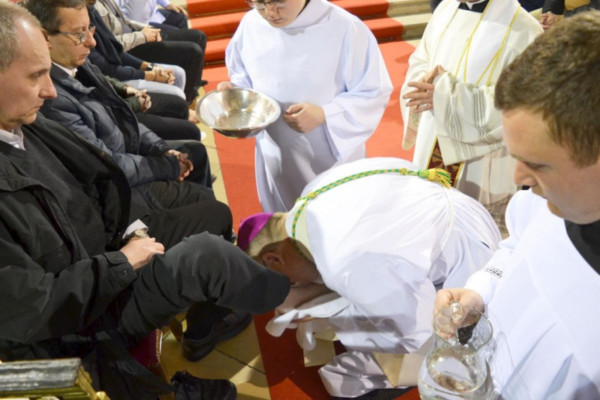 A prédikáció után az egyházmegye elöljárója, az Úr Jézus által mutatott szeretetcselekedet jeléül, tizenkét – erre a célra kiválasztott – férfinak mosta meg a lábát.