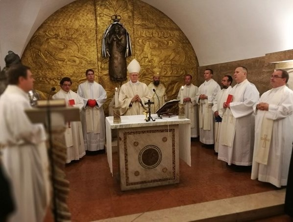 Az ünnepi szentmisére zsúfolásig megtelt a kápolna, elsősorban a Pécsi Egyházmegyéből érkezett zarándokokkal. A koncelebrációt Erdő Péter bíboros prímás, esztergom-budapesti érsek vezette, akivel Kocsis Fülöp görögkatolikus érsek, a Pápai Magyar Intézet ösztöndíjas papjai és Arkadiusz Nocoń lengyel pap is együtt misézett. A szentmise végén Németh László olaszországi magyar főlelkész köszöntötte a bíborost, a szentmisét bemutató papokat és a híveket. Utalt arra, hogy 1980-ban II. János Pál pápa szentelte fel azt a kápolnát, amelyet VI. Pál pápának köszönhetünk. Azóta az egyiket boldogként a másikat pedig már szentként tiszteljük.