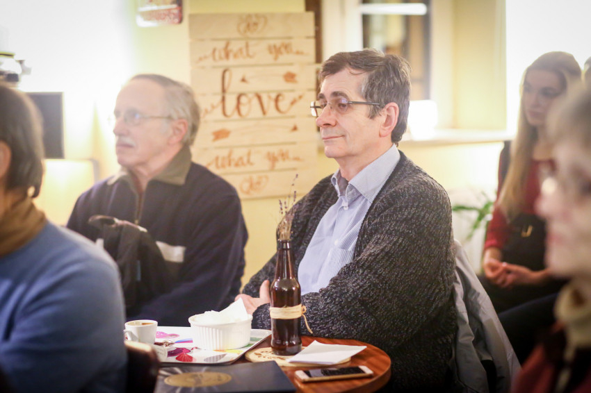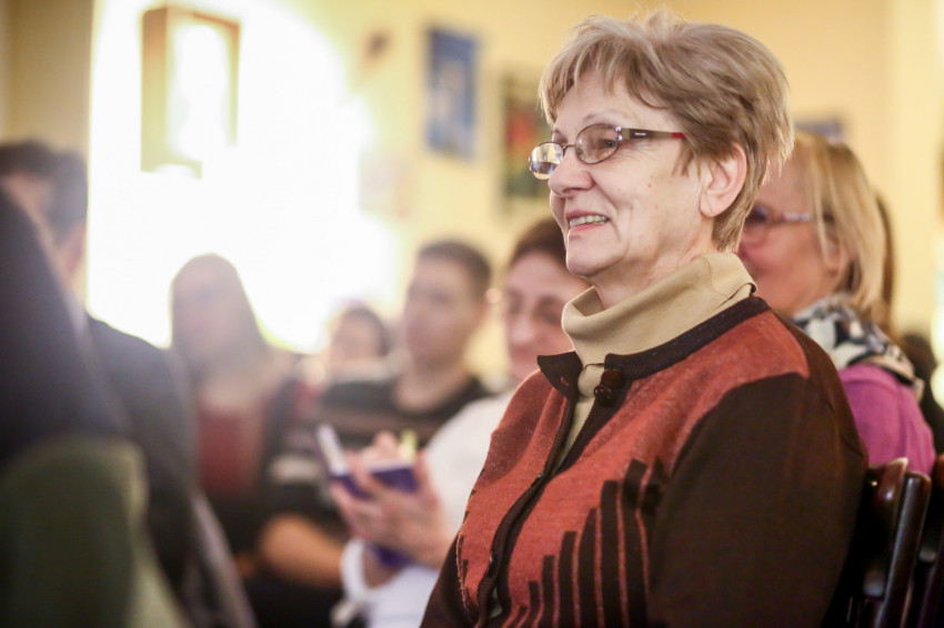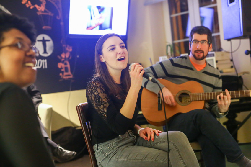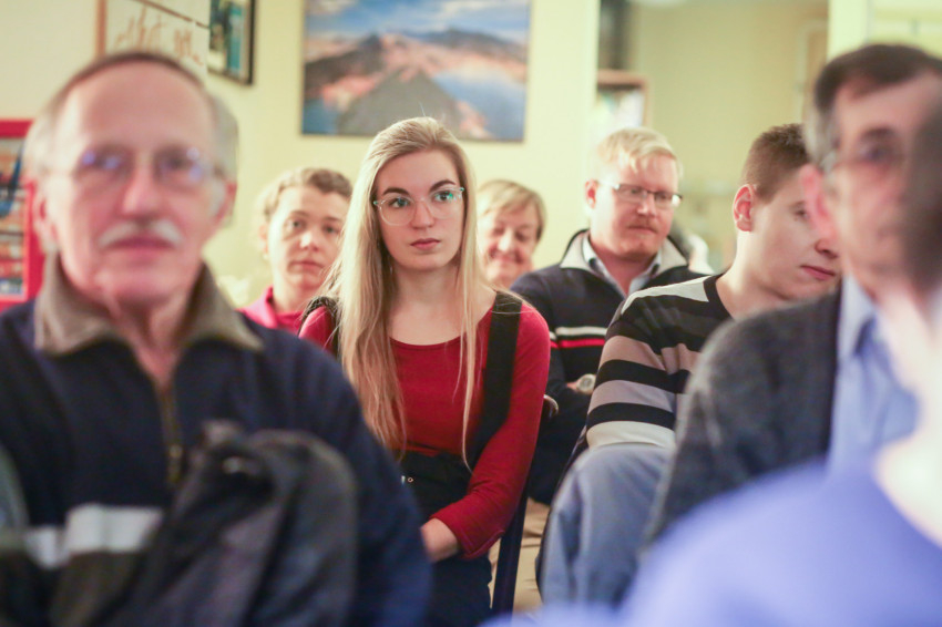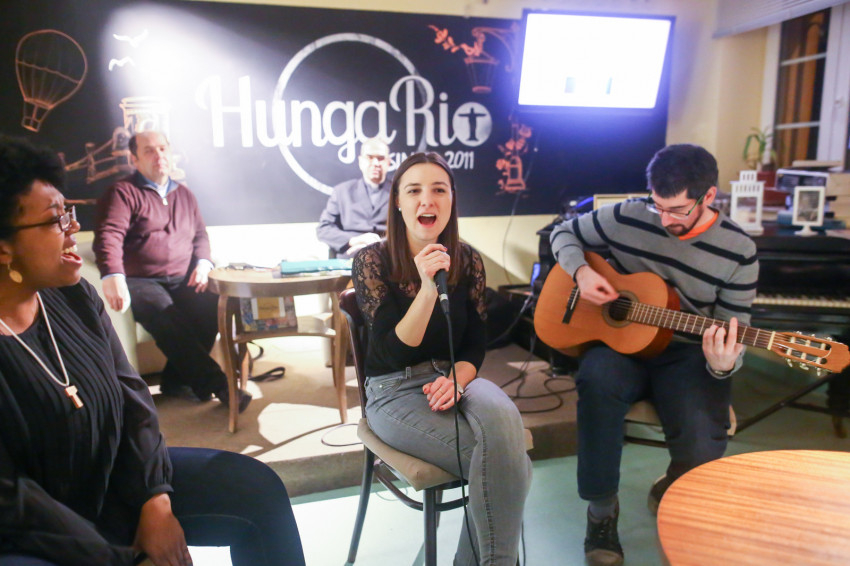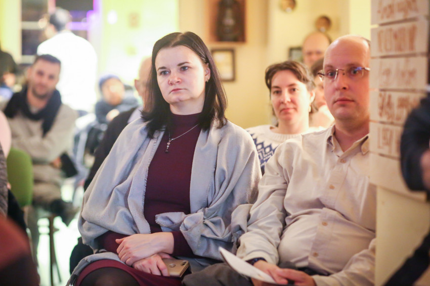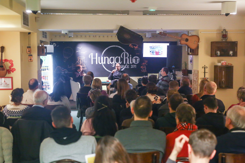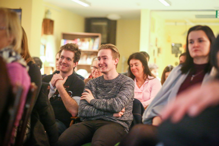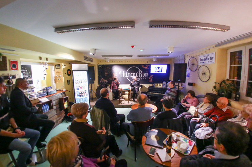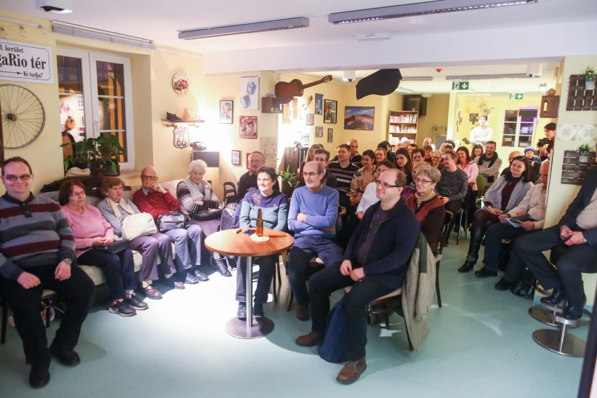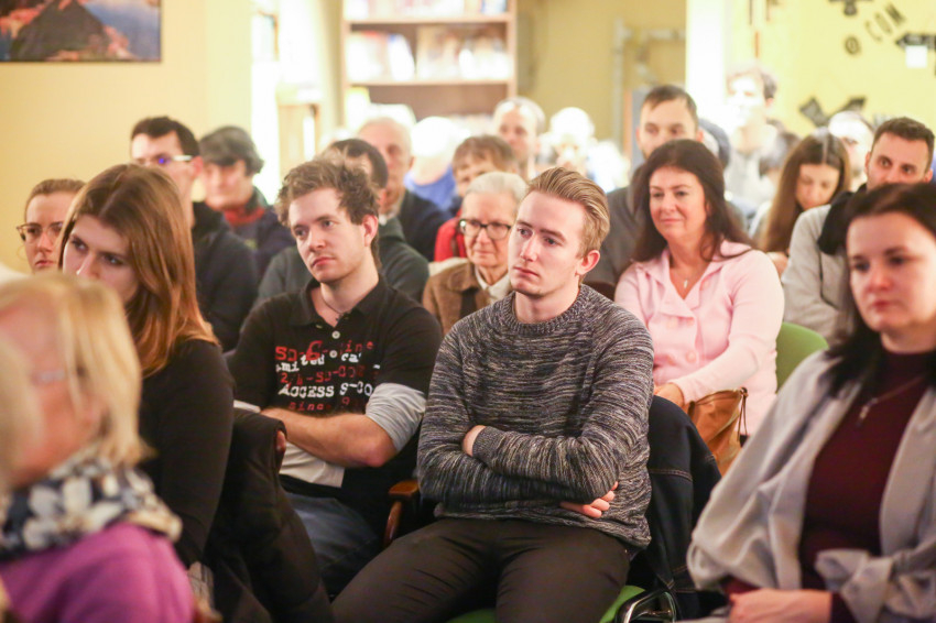 Már a beszélgetés kezdete előtt látszott, hogy telt ház lesz; egymás után kellett székeket hordani minden apró, szabadon maradt helyre, miközben a Shalom közösség tagjai zenéltek a színpadon.